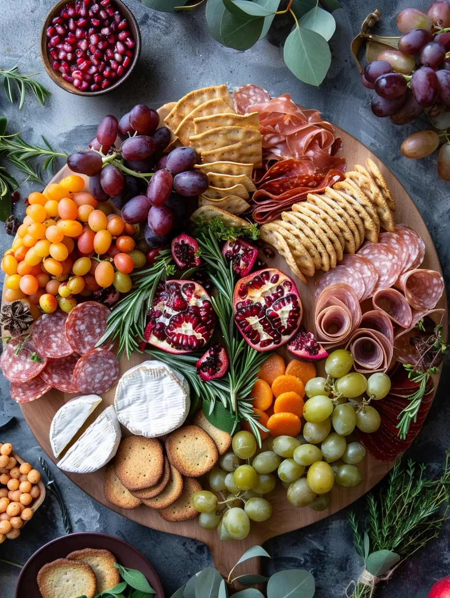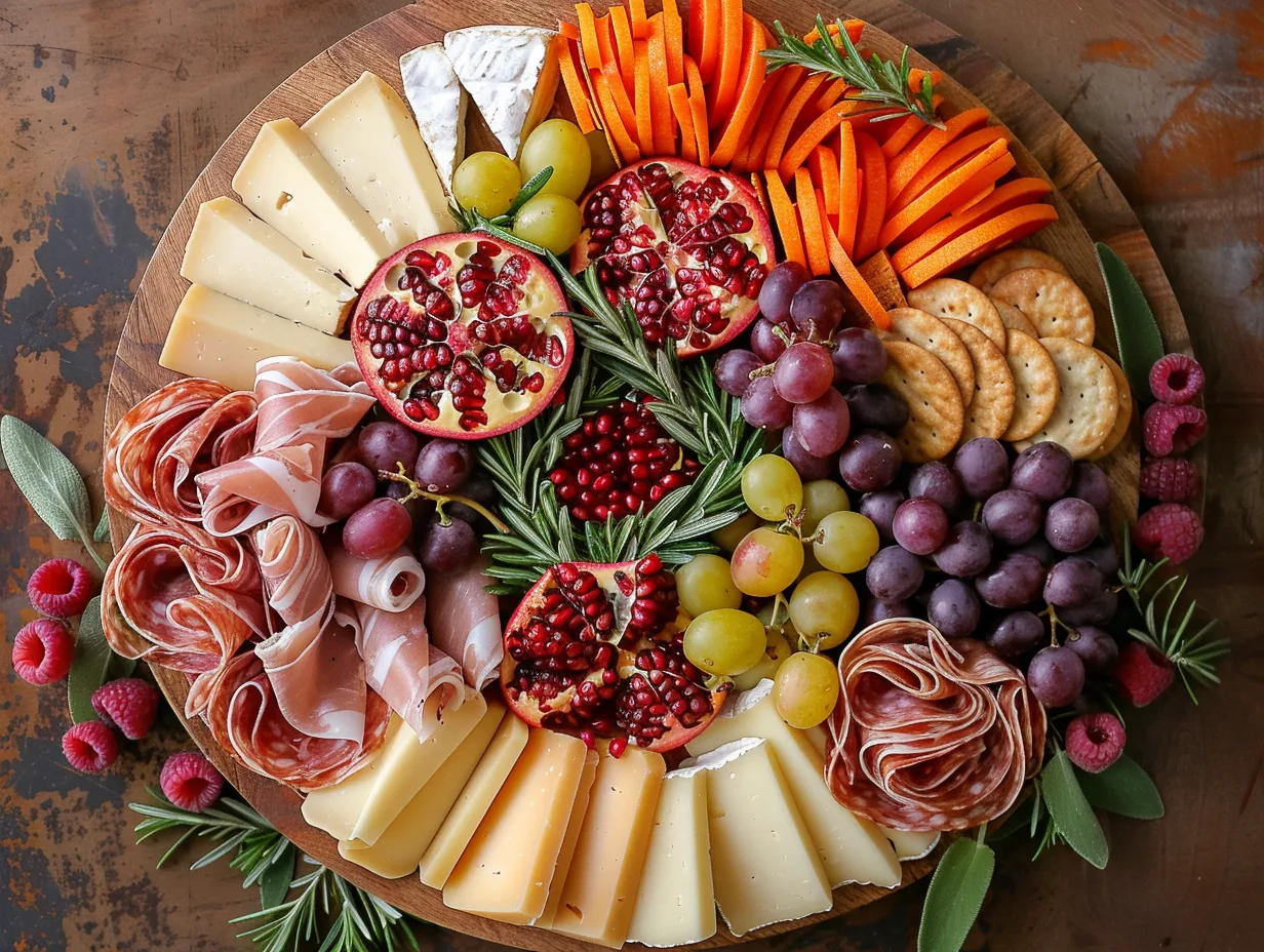 Seasonal fruits bring color and natural sweetness. Red and purple grapes, pomegranate arils, fresh raspberries, and sliced apples represent autumn’s abundant harvest and provide refreshing contrast to rich cheeses and meats.