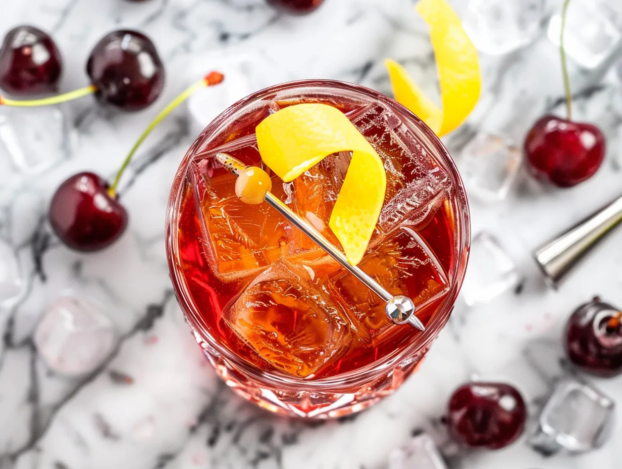 Garnish with a fresh cherry and a lemon twist, expressing the lemon oils over the drink before dropping it in. This final touch adds aromatic elements that enhance the first sip and complete the sensory experience.
