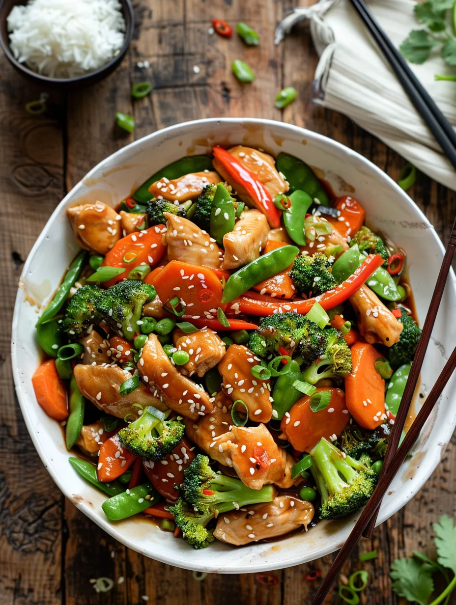 The Instagram Shot If you enjoy food photography, Chicken Stir-Fry is wonderfully photogenic. Natural lighting is your friend—avoid the overhead kitchen light. Shoot from a 45-degree angle to show depth, or directly overhead for a full view of the colorful ingredients. Scatter a few whole snap peas, a small pile of sesame seeds, or a neat stack of green onion slices nearby to add interest to the composition. A pair of chopsticks resting against the bowl or a linen napkin partially in frame adds context and warmth.
