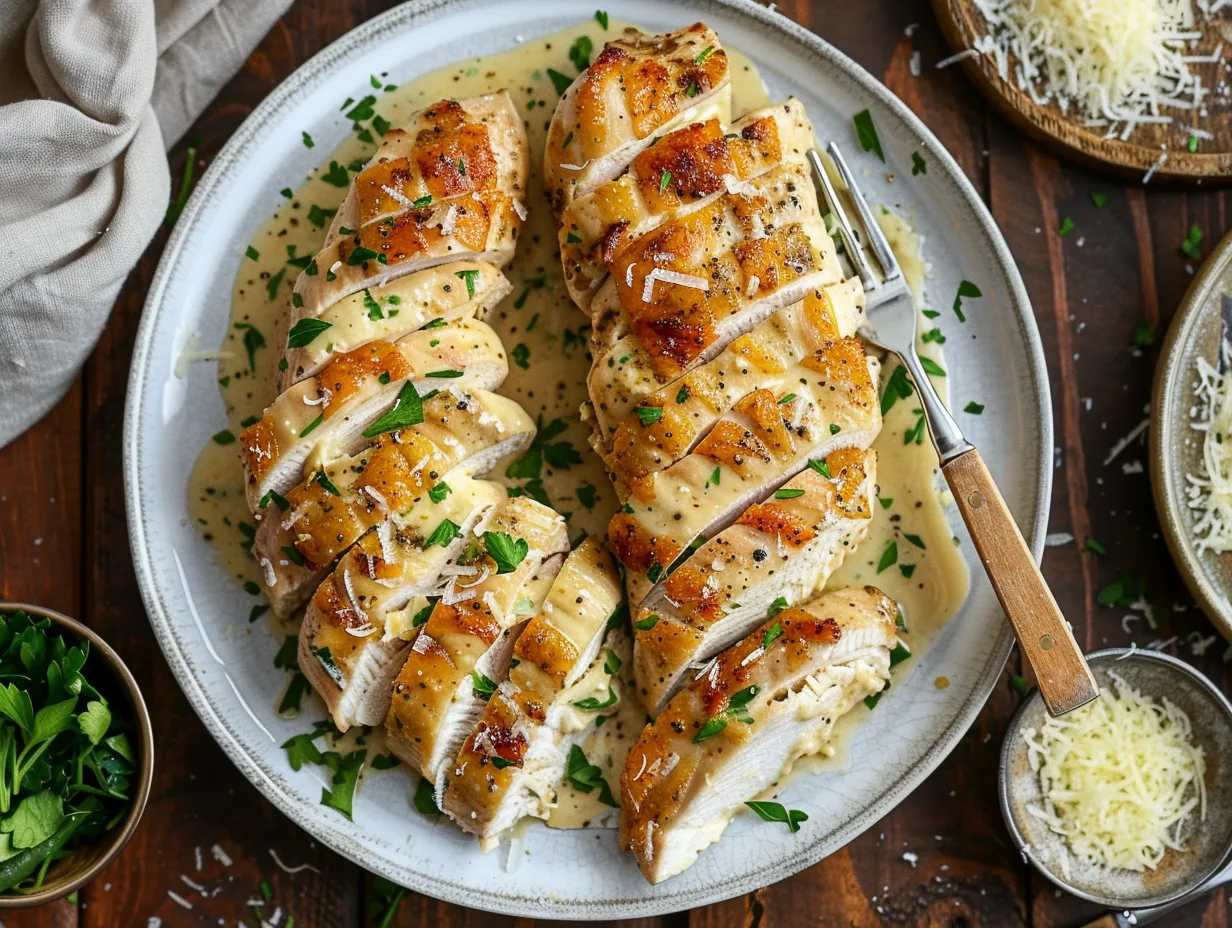 Presentation transforms your Creamy Garlic Parmesan Chicken from a simple weeknight dinner into an impressive culinary experience. Start with warmed plates – this simple touch keeps your dish at the perfect temperature and shows attention to detail. Slice the chicken breast diagonally into thick medallions, fanning them out on the plate to showcase the juicy interior.