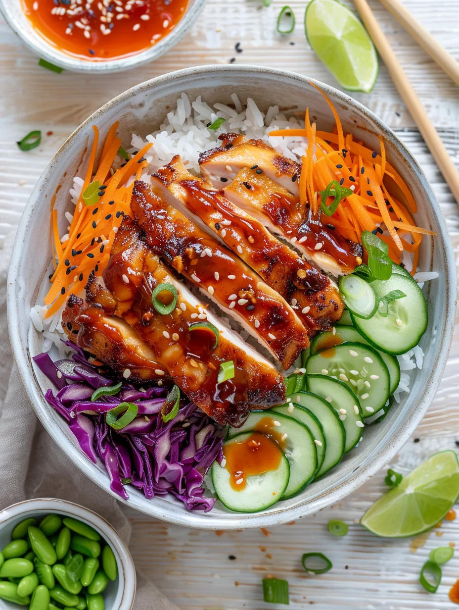 For an Instagram-worthy presentation that’ll make your followers hungry, focus on height and color contrast. Mound the rice slightly in the center rather than spreading it flat, then lean the chicken slices against this rice mountain. Tuck vegetables around the base, alternating colors for maximum visual impact—the vibrant orange carrots next to deep purple cabbage, bright green edamame beside pale cucumber. Drizzle the gochujang cream sauce over the chicken in artistic zigzags or a spiral pattern, letting it pool slightly around the rice. Finish with a generous sprinkle of toasted sesame seeds, thinly sliced green onions, and if you’re feeling fancy, a few microgreens or a lime wedge on the side.