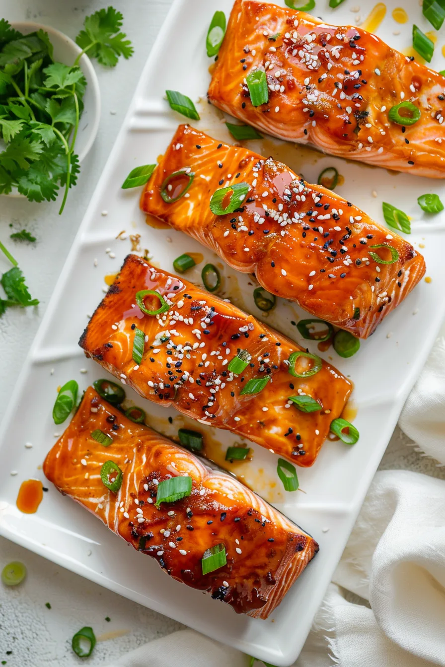 Garnish your maple glazed salmon with thinly sliced green onions for a pop of color and fresh flavor. The bright green contrasts beautifully with the rich, dark glaze.