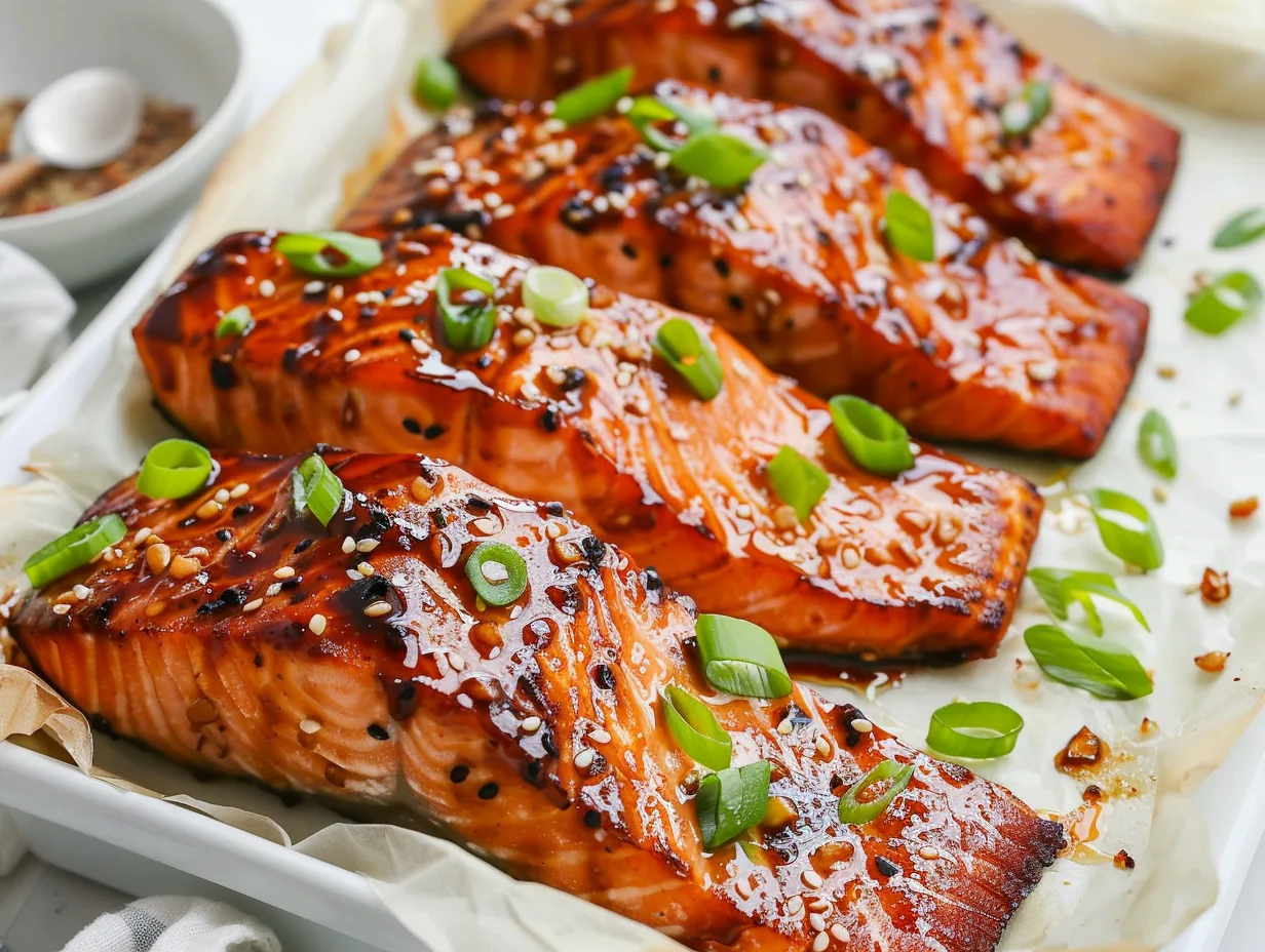 Garnish your maple glazed salmon with thinly sliced green onions for a pop of color and fresh flavor. The bright green contrasts beautifully with the rich, dark glaze.