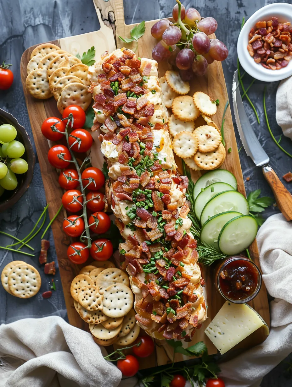 Fresh Elements: Balance the richness with fresh, crisp vegetables. Celery sticks, cucumber rounds, and bell pepper strips all provide refreshing contrast. Cherry tomatoes add acidity that cuts through the richness, while apple slices offer sweetness that complements the bacon’s smokiness.