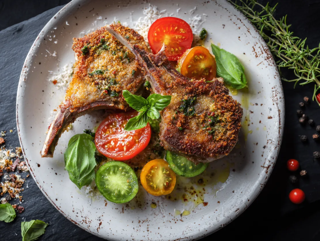 For those who can’t find or don’t enjoy green tomatoes, firm red tomatoes work beautifully, though you’ll want to add a splash of white wine vinegar to the salad to replicate that bright acidity. Tomatillos make an interesting alternative that actually enhances the dish’s complexity with their subtle tartness and firm texture. When it comes to the cheese component of your pepper and parmesan crusted lamb cutlets, aged Pecorino Romano can substitute for Parmesan, bringing a sharper, more assertive flavor that some prefer with lamb.