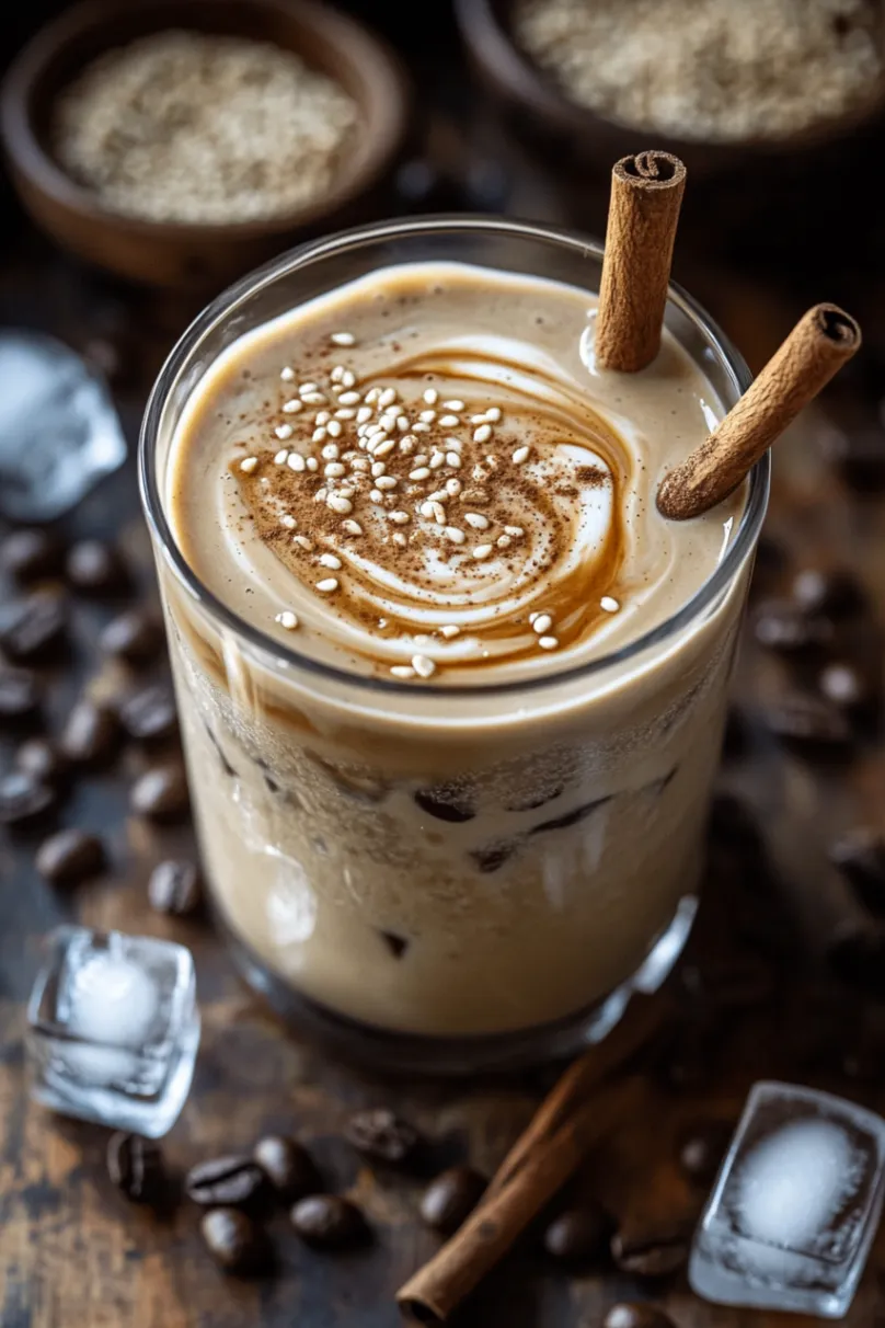 My favorite way to serve tahini iced coffee is in clear glass mugs or tall glasses that showcase the drink’s gorgeous color and creamy consistency. I love to add a small drizzle of extra tahini on top, creating beautiful swirls that slowly sink into the coffee. A light dusting of cinnamon or a few toasted sesame seeds sprinkled on top adds visual interest and hints at the flavors within. For special occasions, I’ll rim the glass with a mixture of sugar and ground cinnamon, similar to how you’d rim a margarita glass.