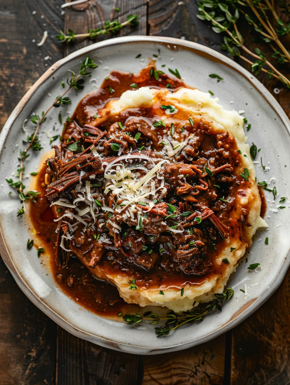 Tender Short Rib Ragu Over Silky Parmesan Mashed Potatoes”