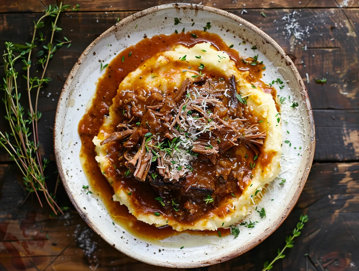 Tender Short Rib Ragu Over Silky Parmesan Mashed Potatoes”