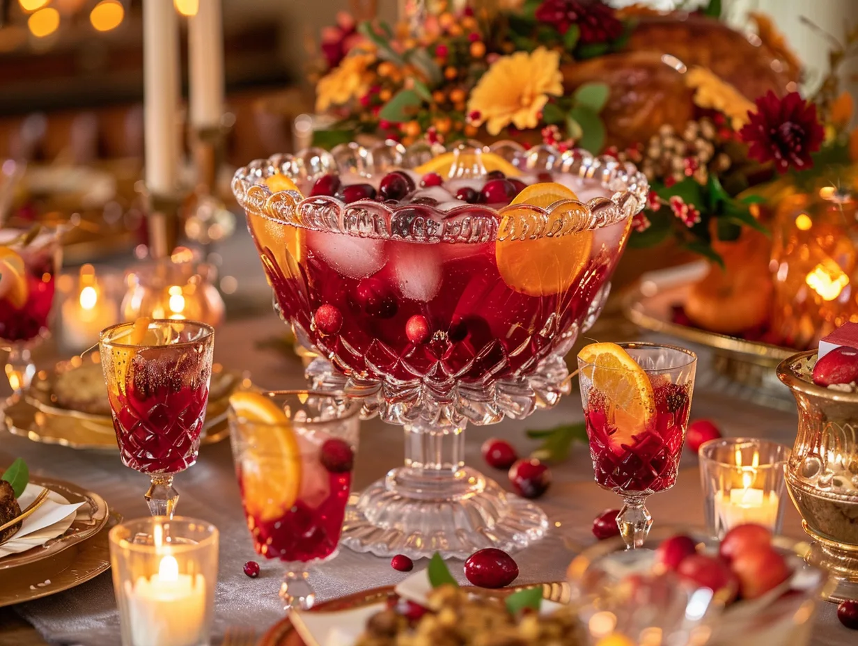 The punch works wonderfully with traditional Thanksgiving dinner courses. Its bright acidity cuts through rich turkey gravy and buttery mashed potatoes. The cranberry notes echo cranberry sauce while adding liquid refreshment to balance the heavy meal.