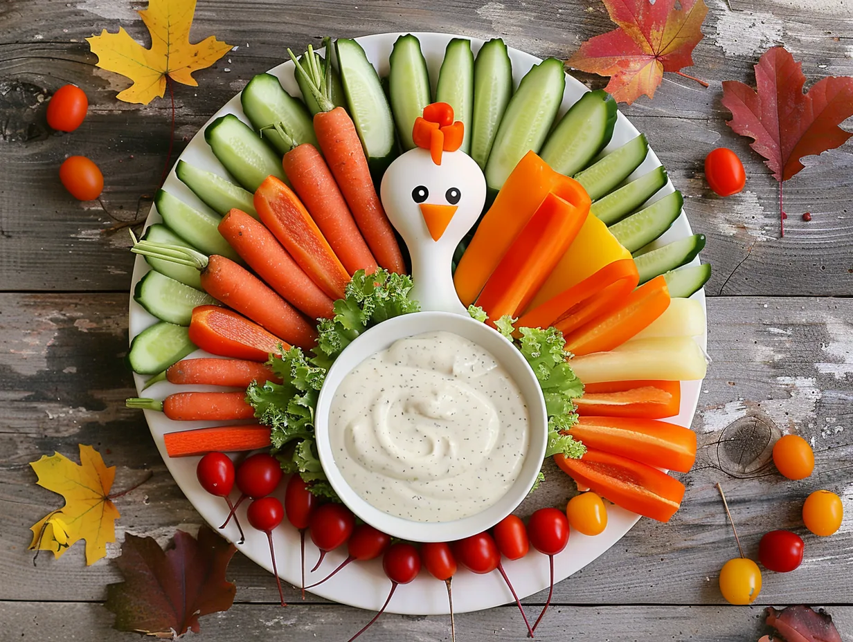 Q: What’s the best dip to use for the center of a turkey veggie platter? A: Ranch dressing and hummus are the most popular choices, but the best dip depends on your guests’ preferences. For traditional crowds, classic ranch or blue cheese works wonderfully. Health-conscious guests appreciate Greek yogurt-based dips or various hummus flavors. For fall themes, try pumpkin hummus or maple-mustard dip. Consider offering 2-3 small bowls with different options rather than one large bowl, allowing guests to choose their favorite while maintaining your turkey design.