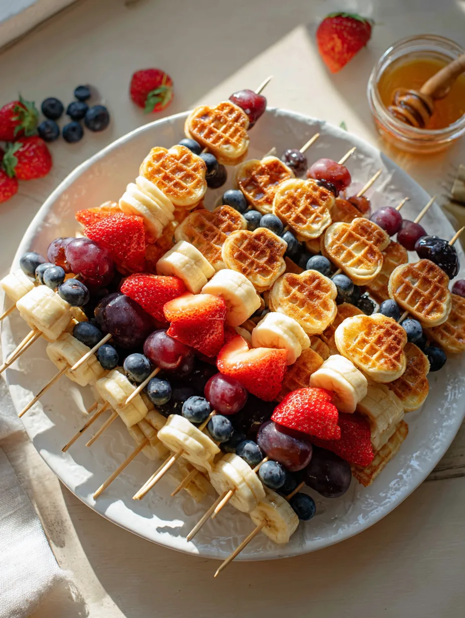 For brunch gatherings, waffles fruit skewers work beautifully as part of a larger spread. They provide a healthy, colorful option that balances richer items like quiche or breakfast casseroles, and their handheld nature makes them perfect for mingling situations where people want to move around while eating.